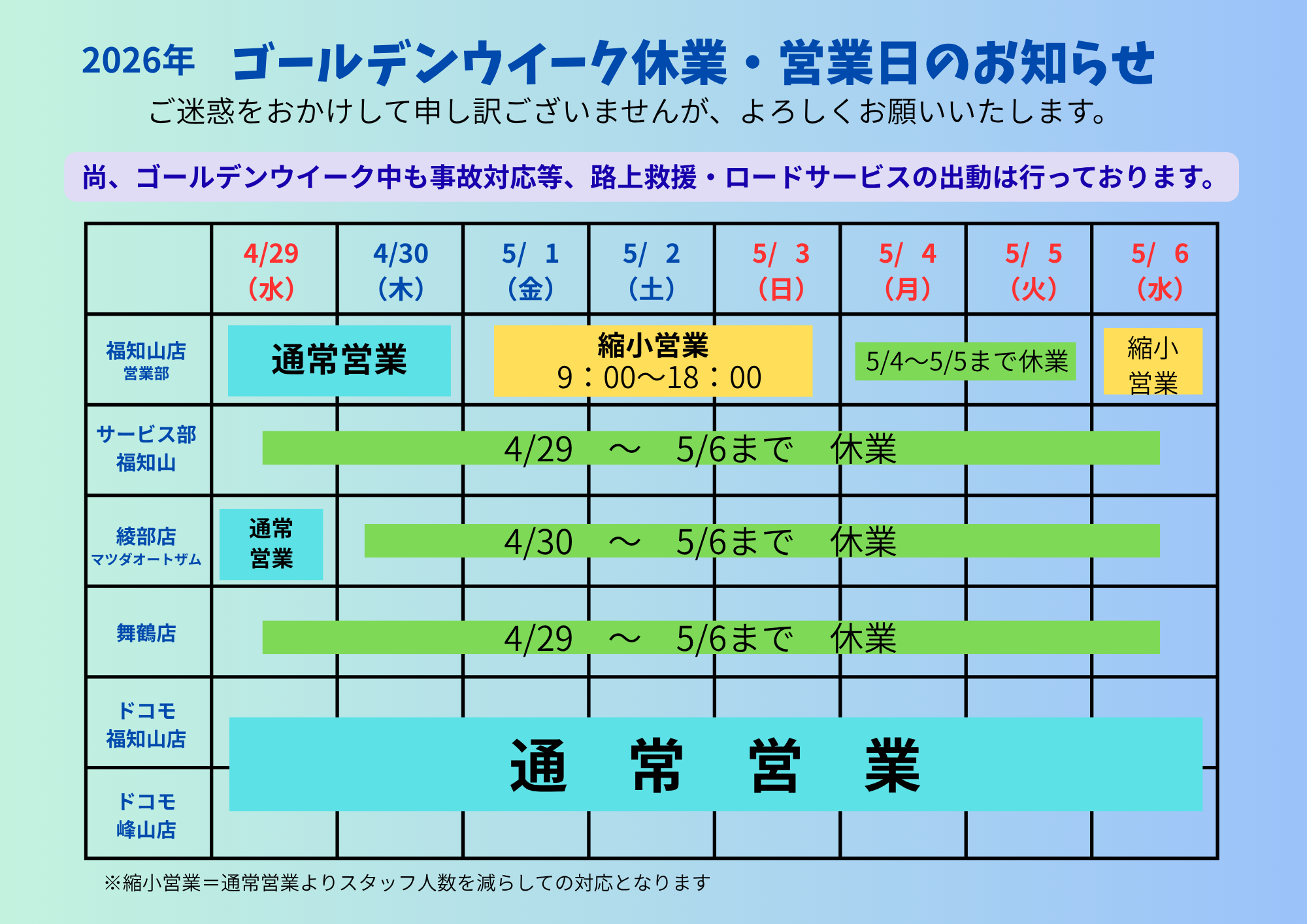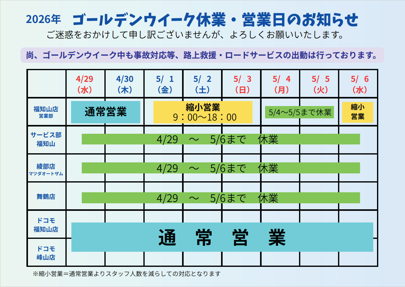 ゴールデンウィーク期間中の営業について