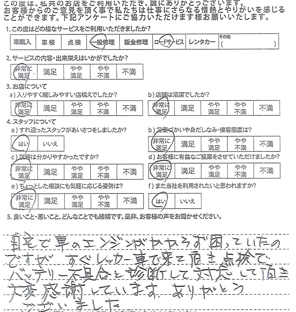 自宅で車のエンジンがかからず困っていたのですがすぐレッカー車で来て頂き